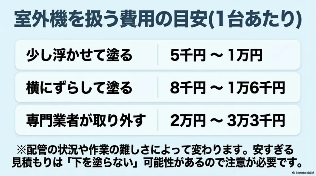 室外機の対応費用は、単体で見ると数千円から数万円の幅がありますが、これは「どの程度の工数をかけるか」によって決まります。