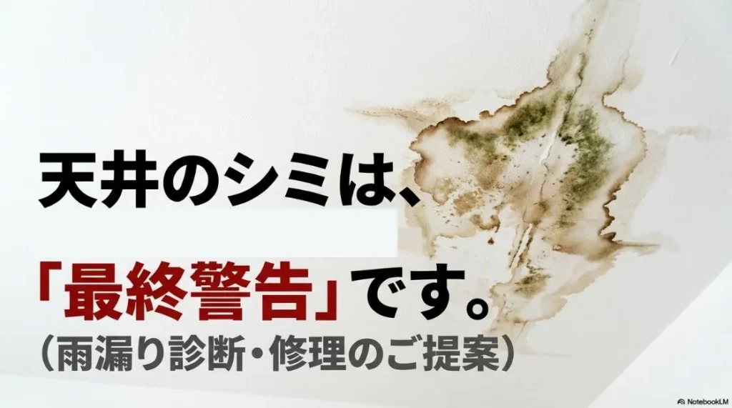 天井のシミ一つとっても、それが自然の猛威によるものなのか、設備の寿命によるものなのかで、あなたの取るべき行動は180度変わります。